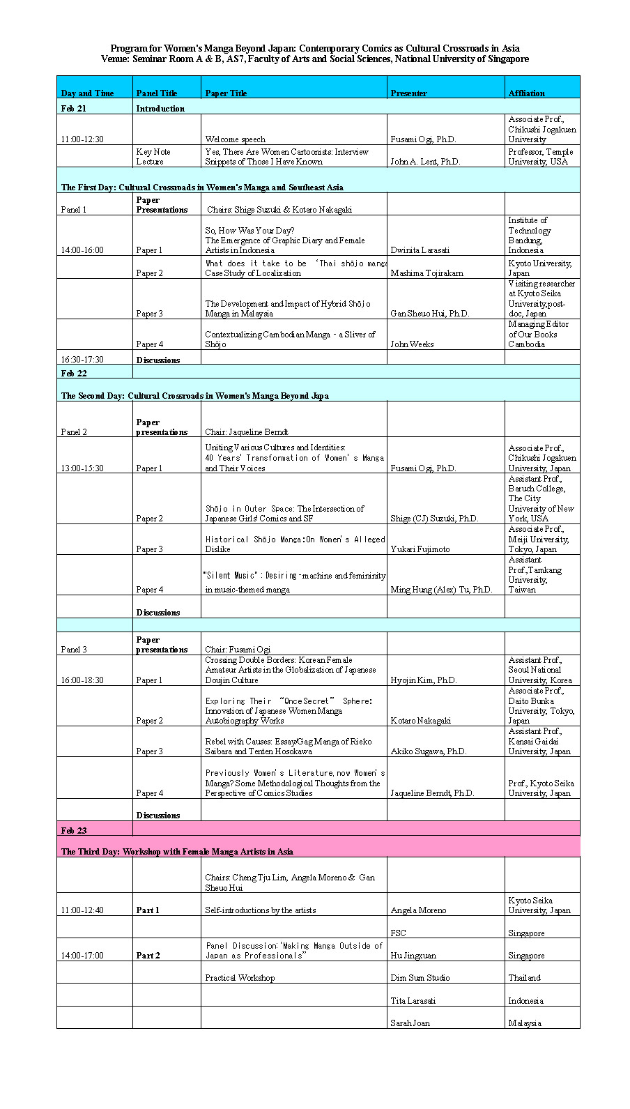 Inviting John. A. Lent as a keynote speaker, a forerunner who has contributed to unite comics, comics artists, and comics scholars all over the world, and focusing on female artists and their works in Asia from both scholarly and artistic perspectives, we would like to examine the ongoing conceptualization of manga, which has perhaps proved more inspiring to female readers and authors than any previous form of comics anywhere in the world.